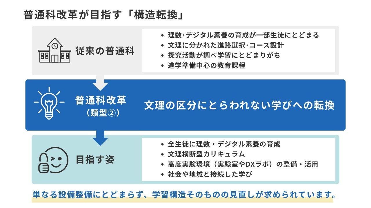 3類型はいずれも重要な取組ですが、中でも高校全体の約7割を占める普通科を対象とする「類型② 普通科改革」は、多くの学校にとって直接的に関わるテーマです。ここからは、この類型②をより詳しく見ていきます。
