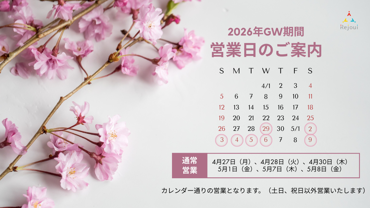 2026年のゴールデンウイーク期間は、カレンダー通りの営業となります。(土日祝日のみ休業)
