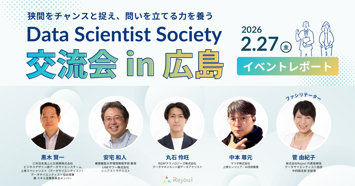 データサイエンティスト協会(DS協会)中四国支部の交流会イベントが広島にてハイブリッド開催されました。本イベントは、「データサイエンス×地方創生」や「生成AI時代のキャリア」などをテーマに、この領域の第一線で活躍するプロフェッショナルたちが登壇しました。会場には、データサイエンスに関心を持つ一般の方から実務担当者まで幅広い層が参加しました。熱気あふれる議論と交流が交わされた一夜の様子を、たっぷりとレポートしてお届けします!