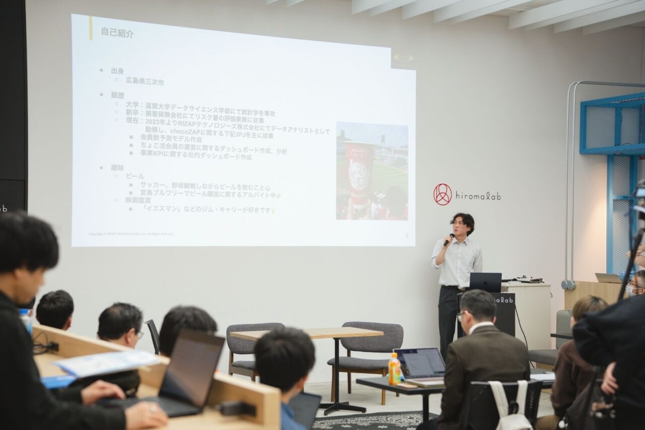 実務の紹介では、「チョコザップ」の急速な店舗展開を支える会員数予測モデルの開発や、モデル運用を効率化するMLOps(機械学習の自動実行環境)の構築といった、事業の成長に直結する実践的なデータ分析の取り組みが紹介されました。また、新機能やサービス導入時の効果検証(A/Bテスト)においては、店舗特性の偏りを防ぐ要件設計や、適切なサンプルサイズの算出など、分析者ならではの精緻なアプローチが紹介され、現場のリアルな知見が共有されました。